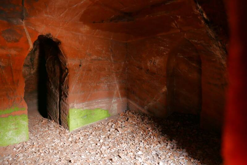 Photo below: a chamber in Lacey's Caves, with an entrance to the cliff allowing daylight in, in addition to the passage entrance on the left, and to the spirit door on the right. Note how the spirit door in particular seems well-carved, and note how this site bares similarity to sites such as Anchor Church in Derbyshire for instance.