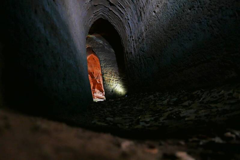 Photo below: a length of tunnel within Lacey's Caves, connecting the back parts of various chambers. Note how another doorway can be seen at the centre of the image, further back from the first, which connects the following chamber to the one after. Note again the similarity of the shape of the tunnels to for example doorways and tunnels within churches, something to do with acoustic properties perhaps?