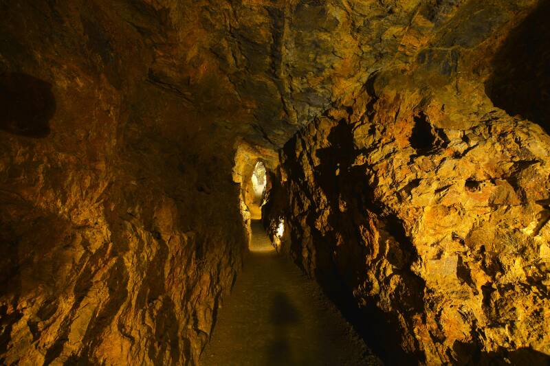 Photo below: another section of passage in the Great Orme Bronze Age copper mines, this one sloping steeply downward. These tunnels are very much a maze of complex workings, and when I wander around this place, I find it a little hard to get my bearings. Some of the tunnels are quite straight, others twist and turn like funnels, moving from chamber to chamber.